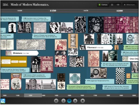 这款应用参考了Men of Modern Mathematics的原型,它是一款由Charles Eames和妻子Ray Eames于1964年制作的长约50英尺的交互式数学史展示装置。而这次IBM推出的这款应用能让用户以数字版本的形式浏览之前的信息图表,其中以交互式时间轴关联了500多个数学界人物的传记、数学史上重要里程碑事件和相关产品图片。